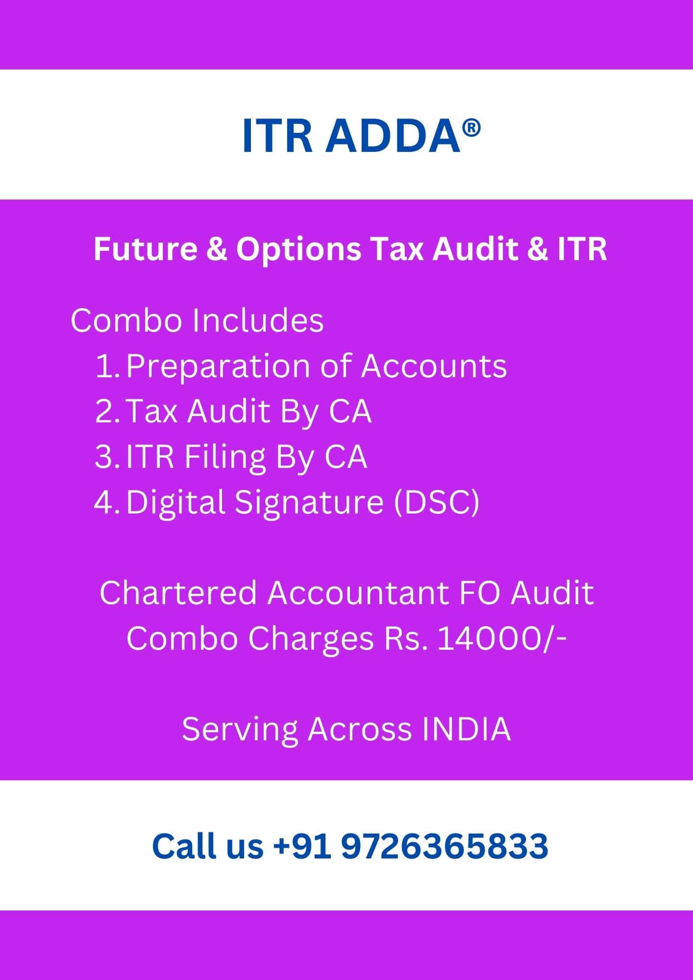 Looking for a Chartered Accountant for F&O Tax Audit? At ITR Adda, we provide expert consultancy for Futures & Options (F&O) traders across India. Whether you are a retail trader, professional investor, or high-volume derivatives trader, our CA team ensures fully transparent and accurate tax filings. With online consultation and digital filing support, you don’t need to search endlessly for “CA near me”. No matter where you trade from, our Chartered Accountants at ITR Adda are just a click away to handle your F&O audit and ITR filing hassle-free.